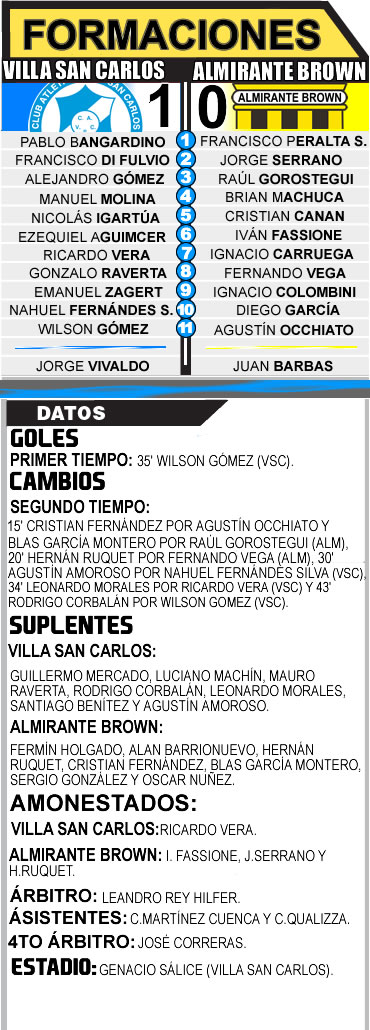 Otro triunfo ajustado logró el conjunto de Jorge Vivaldo, la “villa” esta vez superó por 1 a 0 a Almirante Brown en condición de local, nuevamente Wilson Gómez volvió a marcar para darle el triunfo a los de Berisso que llegaron a 18 unidades y quedaron a solo siete puntos de alcanzar a la “fragata” en la tabla de promedios.
