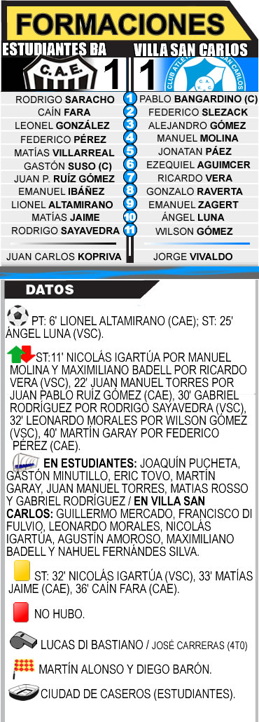 Posteriormente, la “villa” lo supo supo aguantar en base a una destacada labor de su arquero Pablo Bangardino, y también porque quizás Estudiantes desperdició sendas oportunidades en materia ofensiva, aunque los tres puntos podían haber viajado hacia Berisso, ya que la visita por momentos se plantó en campo rival y tuvo periodos anímicos altos en el tramo final del partido jugado en el estadio ciudad de Caseros.