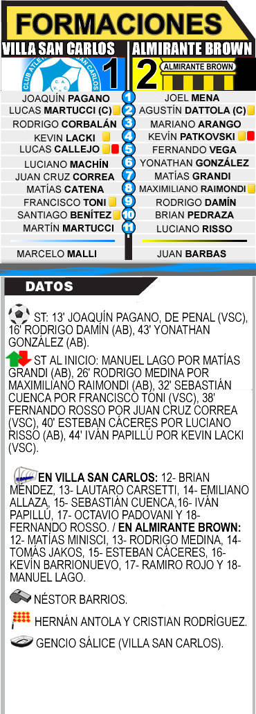 El empate parecía confirmarse, pero tras una mala salida del “uno” villero en una pelota parada le dio la posibilidad a Yonathan González de conectar de cabeza sobre los 43 minutos para darle un triunfazo sobre la hora a su equipo y escalar así a la primera posición, tras la caída de Excursionistas en su visita a Atlanta. Posterior al gol de Almirante vería la roja Lucas Callejo dejando al conjunto de Malli con un jugador menos.