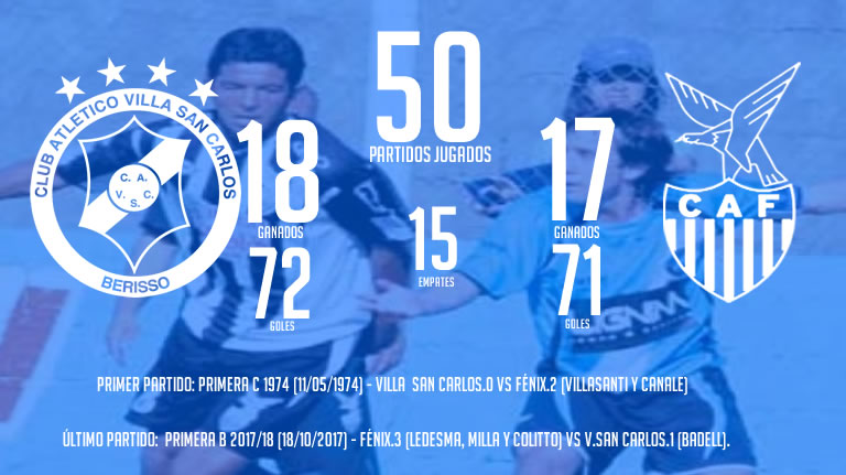 Un historial muy parejo llevan Villa San Carlos y Fénix, donde se enfrentaron en 50 ocasiones, con 18 triunfos villeros, 17 del “cuervo” de Pilar y 15 empates. El último antecedente fue en cancha de San Miguel por la novena fecha del actual torneo un 18 de octubre de 2017 y fue triunfo de Fénix por 3 a 1 con goles de Diego Ledesma, Cristian Milla y Lucas Colitto, mientras que Maximiliano Badell descontó para el “cele”.