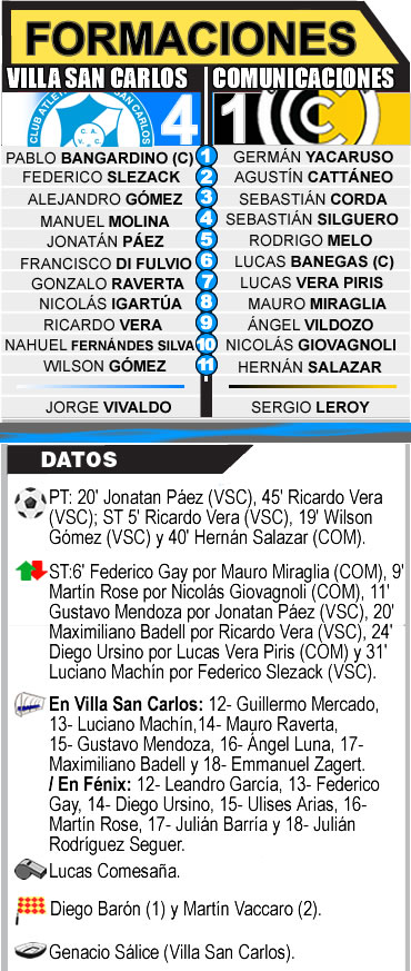 Villa San Carlos jugó el mejor partido en el torneo y venció 4 a 1 a Comunicaciones en el Genacio Sálice, un triunfo importantisimo para quedar a solo una unidad de Almirante Brown en los promedios. Ricardo Vera en dos ocasiones, Jonatán Páez y Wilson Gómez marcaron los goles del villero, mientras que descontó para el “cartero” Hernán Salazar.