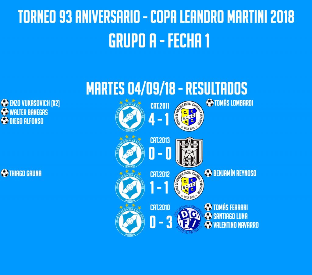 El pasado día jueves concluyó la primera fecha del Grupo A de la Copa Leandro Martini, Torneo 93 Aniversario organizado por la Sub Comisión de Fútbol Infantil del Club Atlético Villa San Carlos. Estrella, AFI 19, Villa Zula y Villa San Carlos integran dicho grupo.