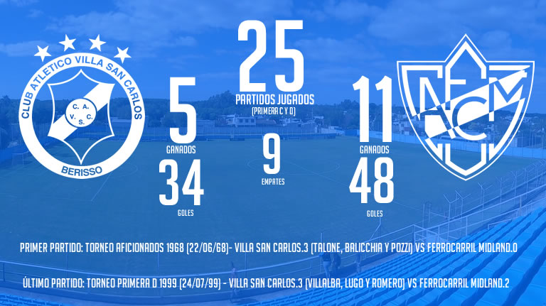 Villa San Carlos y Midland se han enfrentado en un total de 25 encuentros en Torneos de Primera C y D. Los de Berisso cuentan con cinco triunfos, los de Libertad con 11 y han igualado en nueve oportunidades.