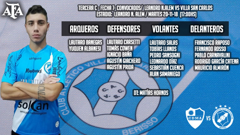 La Tercera División de Villa San Carlos estará visitando este martes a Leandro N.Alem , a partir de las 17:00hs en General Rodríguez, por el encuentro correspondiente a la séptima fecha del Torneo de la Tercera C. El elenco que dirige Matías Hornos buscará un triunfo para seguir en los primeros puestos.