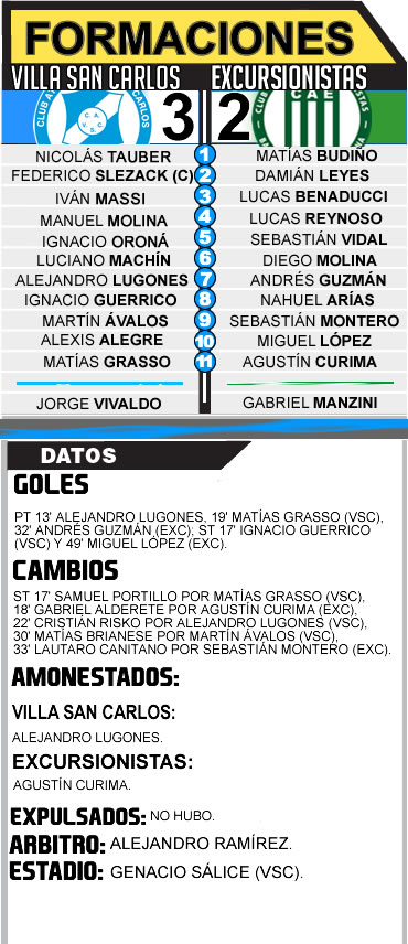 Por el encuentro de ida de la final del Torneo Reducido de la Primera C, Villa San Carlos derrotó en Berisso por 3 a 2 a su par de Excursionistas. Alejandro Lugones; Matías Grasso e Ignacio Guerrico marcaron para el “celeste” mientras que Andrés Guzmán y Miguel López descontaron para “Excursio”.