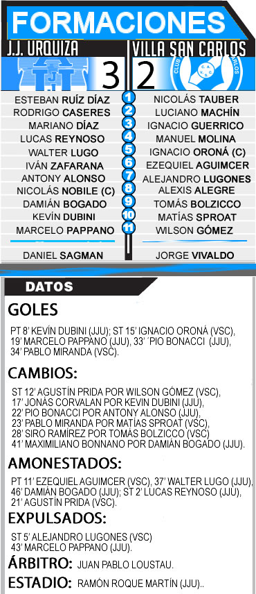 A pesar de tener un hombre menos, el “villero” alcanzó la igualdad a los 15 minutos de ese periodo, después que Ignacio Oroná metiera un cabezazo frontal para dejar sin respuestas al arquero local. El empate se hizo presente. El equipo cambió la imagen de la primera etapa. Sin embargo, llegando a los 20 minutos los locales lograron sobreponerse y llegar a la ventaja tras el tanto de Marcelo Pappano, quien recibió en soledad tras un fallido despeje de Agustín Prida.