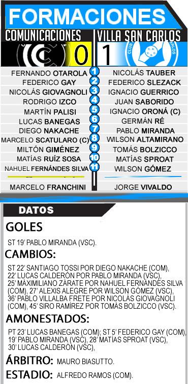 En lo que restó del partido, el villero supo aguantar el resultado, y hasta pudo liquidarlo en los pies de Lucas Calderón, quien pudo haber estirado la ventaja para sellar el encuentro pero terminó dilapidando una chance neta de gol. Comunicaciones intentó hasta el último minuto intentar llegar al empate a través de reiterados centros al área villera, aunque la defensa estuvo solida para evacuar cualquier peligro de gol.