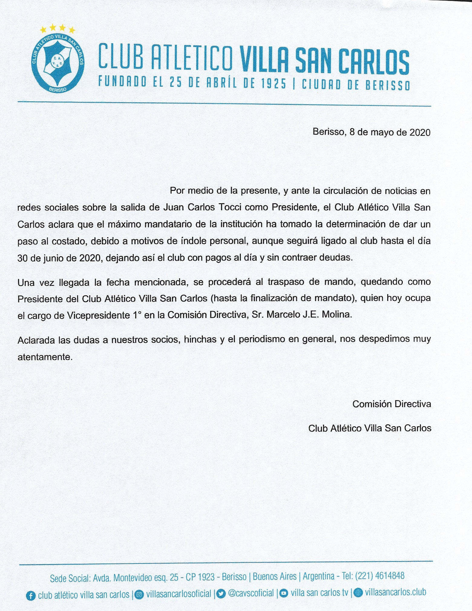 InstitucionalComunicado de Prensa sobre la renuncia de Juan Carlos Tocci Posted on 08/05/2020 by villasancarlosprensa 08 May Actualidad: Villa San Carlos eSports Tercer sábado de Villeros Solidarios