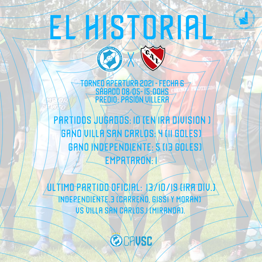 Este sábado, desde las 15:00 horas, Villa San Carlos recibirá a Independiente en el Predio Pasión Villera, por la sexta jornada del Torneo Apertura 2021 de fútbol femenino. El partido contará con el arbitraje de Álvarez De Olivera y no se transmitirá por televisión.